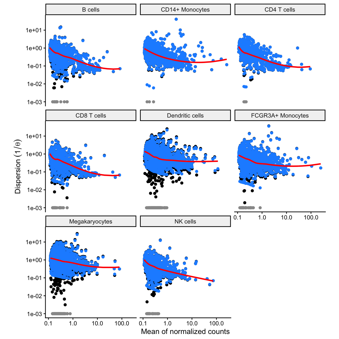 Plot the relationship between the dispersion and the mean of normalizd counts like from DESeq2 (Love, et al. 2014). Here, the y-axis plots where is the overdispersion parameter from the negative binomial model. Black points indicate the maximum likelihood estimate for each gene, red indicates the smoothed trend line, and blue points indicate the values after shrinkage. Grey points indicate dispersion outliers excluded from the trend.