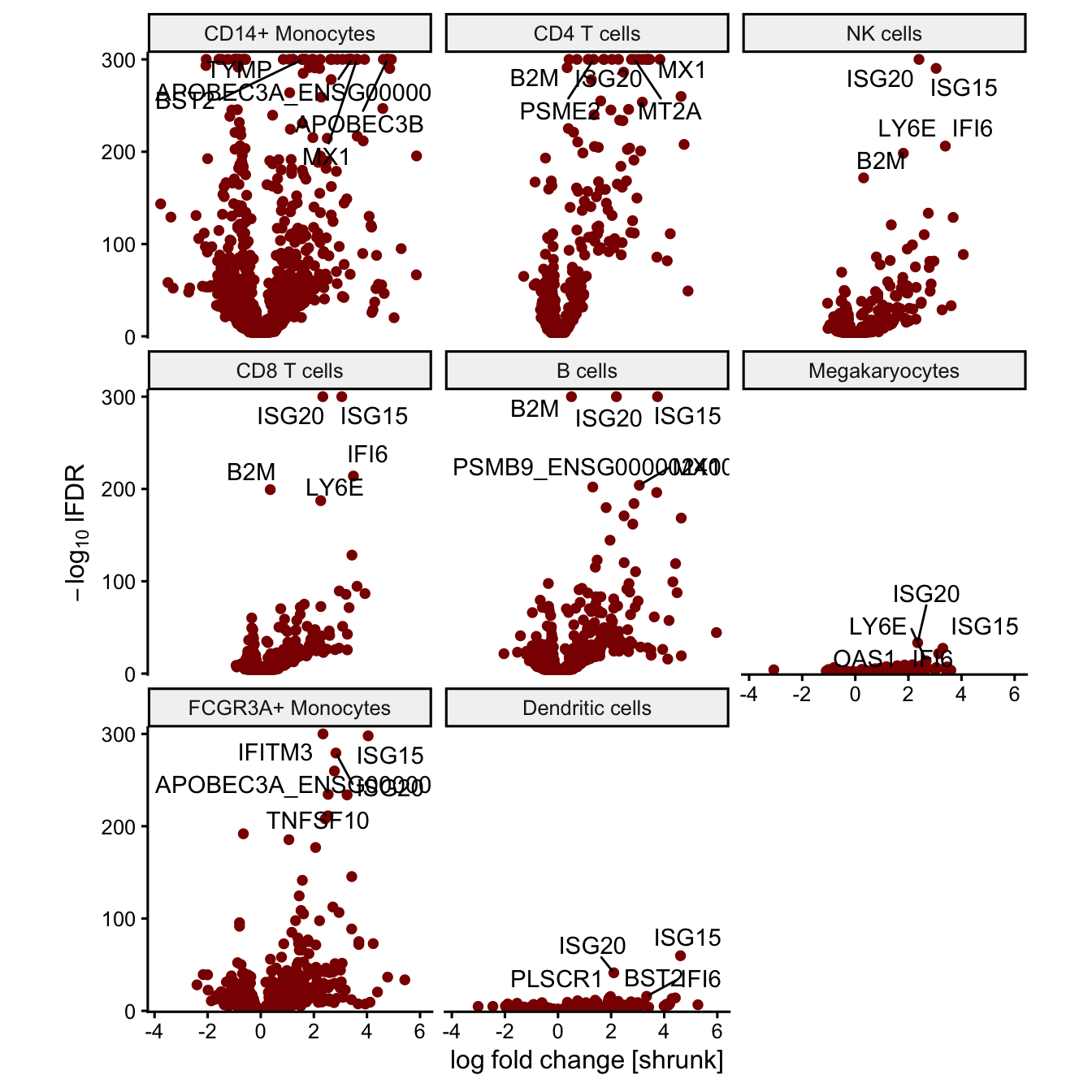 The volcano plot can indicate the strength of the differential expression signal with each cell type. Genes passing the multiple testing correction are shown in red.