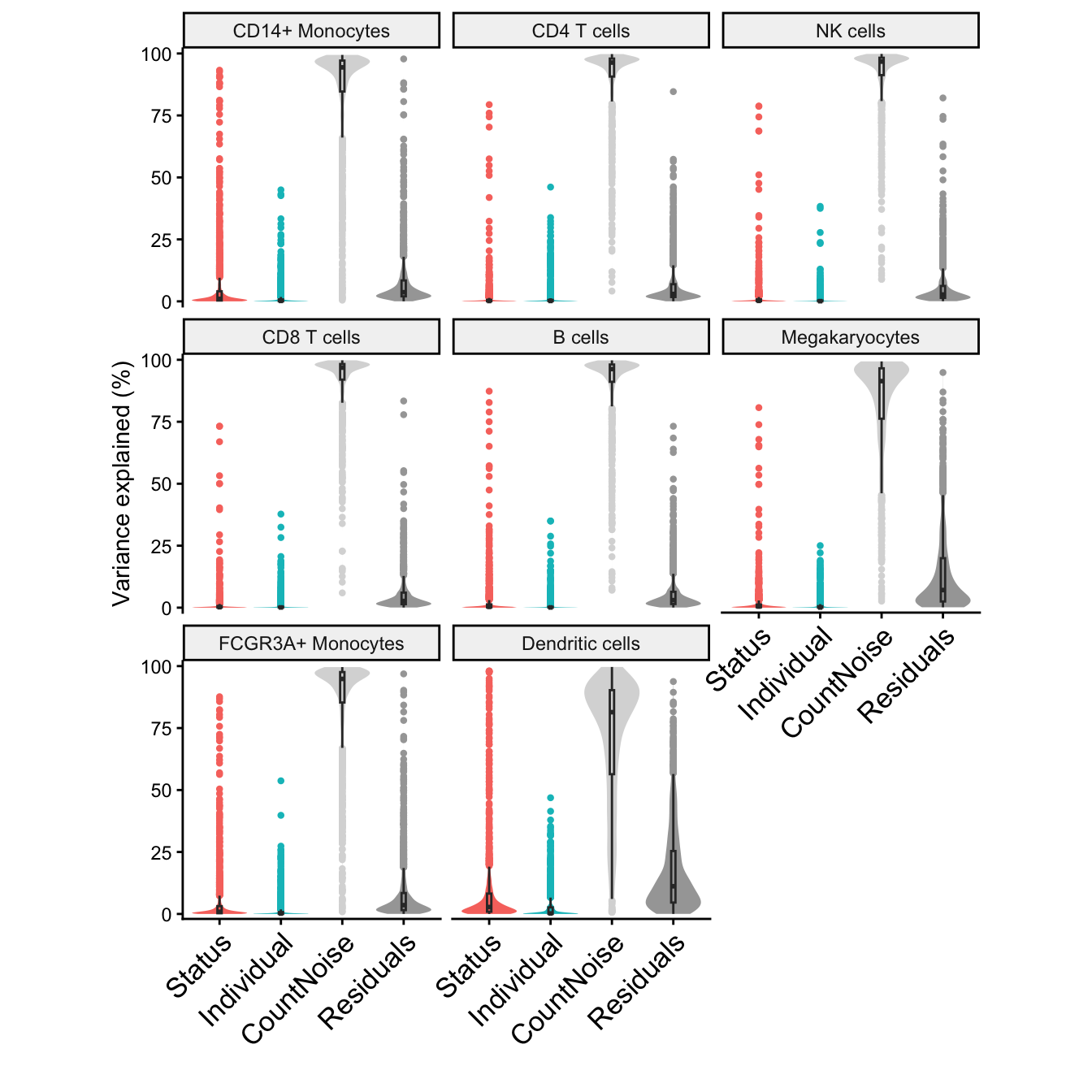 Variance partitioning analysis uses linear or linear mixed models to quanify the contribution of multiple sources of expression variation at the gene-level. For each gene it fits a linear (mixed) model and evalutes the fraction of expression variation explained by each variable. Variance fractions can be visualized at the gene-level for each cell type using a bar plot, or genome-wide using a violin plot.